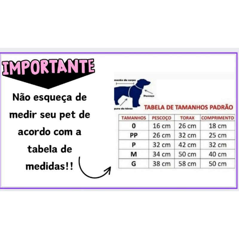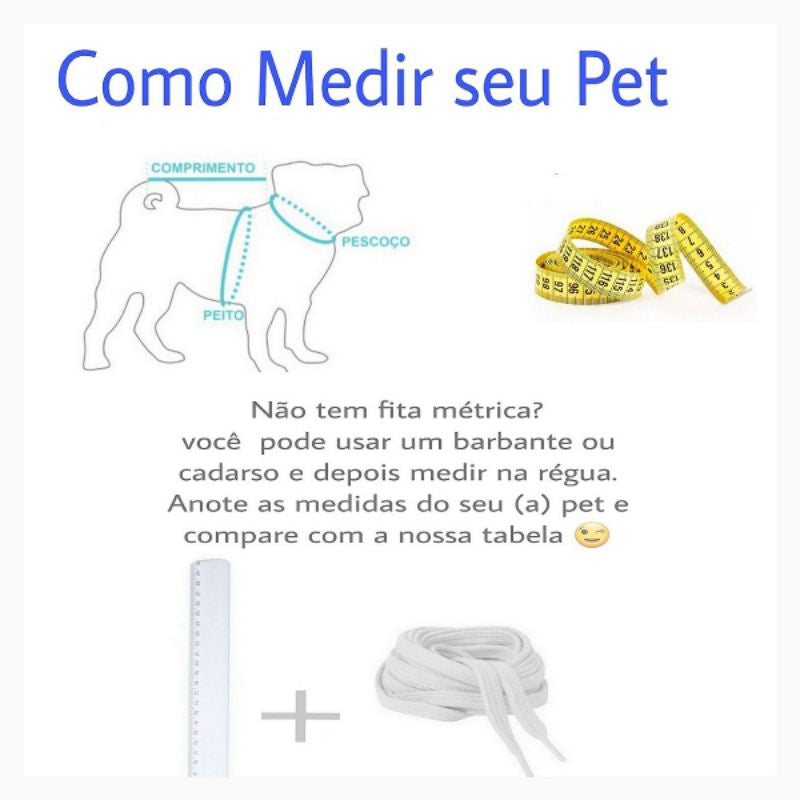 É muito importante que você meça seu pet com calma deixando 2 cm de folga pois vai garantir conforto e mobilidade para seu pet. Após anotar as medidas do comprimento das costas, circunferência do pescoço e tórax, só comparar com as medidas da nossa tabela e escolher o tamanho que mais se aproximar. Não temos como indicar o tamanho correto apenas com a raça, peso ou idade, por isso aconselha-se a medição pois é o método mais garantido de adquirir o tamanho adequado para seu pet.
